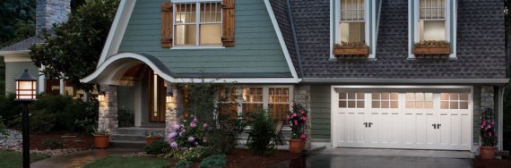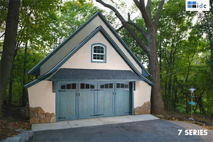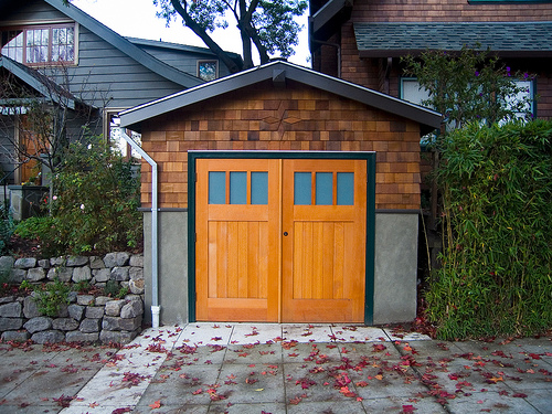 Гараж в стил Arts & Crafts, с характерен Board and Batten дървен сайдинг. Прекрасна масивна дървена гаражна врата и задължителните фенери от ляво и дясно на вратата. Ако и резолюцията на снимката не позволява да се прецени със сигурност, вратата най-вероятно отново е автоматична и секционна. Като четирите крила се вдигат едновременно. Изпълнението отпред е с щампован бетон, който за щастие вече се предлага и в България.