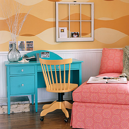 Комбинирането на свежи и контрастни цветовете в интериорания дизайн на тази детска стая й придава много стилен и приятен вид. Използването на меки нюанси и не твърде наситени цветове радва окото. Белият цвят на дървената ламперия служи като чудесна основа, на която да изпъкне контраста между синьото и червеното.