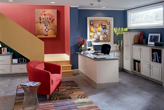 Сутеренът е едно от най-подходящите места в къщата, където можете да си направите домашен офис, особено ако помещението има възможност за широки прозорци. В този стилен и модерен домашен офис пространството към стълбите е оставено отворено, което допълва усещането за просторност. Забележително е използването на контрастни цветове в интериорния дизайн.