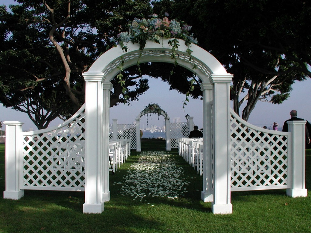 Сватбените арки за интериорни и външни условия могат да се изработят от различни материали, но нищо не може да замени естественото излъчване на изящно направената дървена арка, изработена с орнаментални детайли и боядисана в бяло. Дървото и финият, изпипан детайл сами по себе си носят красота и единственото, което може да ги допълни са свежите цветя. Арка като тази не си струва да обвивате в бяли воали и панделки, както обикновено се прави в арките от ковано желязо или от по-евтини материали като PVC например.