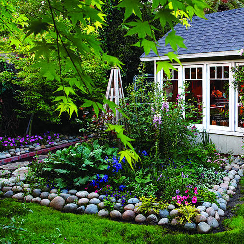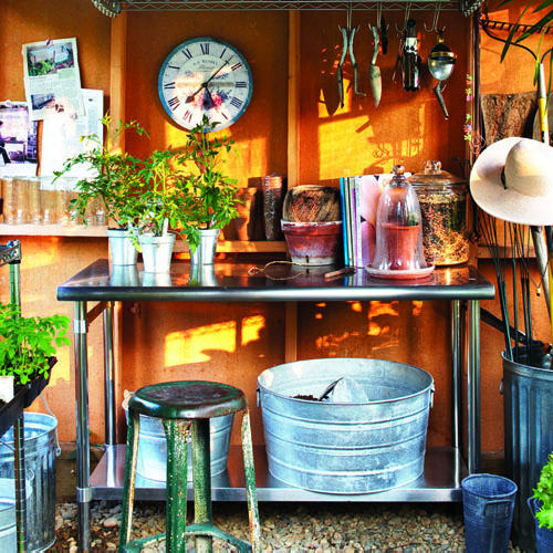 Тази градинска къщичка, която има големи прозорци на три от своите стени, съчетава и двете. Изобилието от прозорци осигурява добрия достъп на слънчева светлина вътре в къщичката. Собственичката е пожелала всички те да могат да се отварят, за да има максимално добра вентилация вътре. Най-западната стена е оставена без прозорци и до нея е поставена работна маса. За организирането на инструментите и вещите, необходими на градинаря, вътре в помещението са използвани преносими рафтове, и контейнери и кофи от издържащ на влага галванизиран метал или неръждаема стомана. Хоризонталните дървени греди от структурата на къщата също се използват като малки рафтове за вази и някои по-малки саксии. Интересното е, че тази барака няма под, а просто дебел слой чакъл, който да попива, ако се разлее вода. Стените са поставени върху циментови основи.