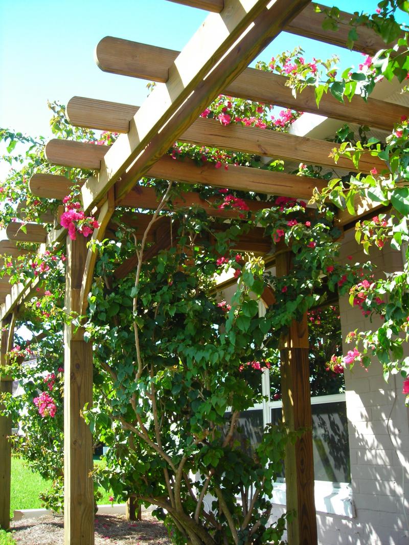 Очарованието и красотата на перголата се подчертават много силно, когато тя се допълни с пълзящи и увивни растения, храсти и цветя, на които тя служи като подпора. Увивните розови храсти са едни от най-подходящите за подобен вид градински структури.