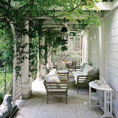 Освен като самостоятелна структура в градината, перголата може да бъде поставена като навес над верандата на къщата. Увивните растения, на които тя служи като подпора, дават своята естествена сянка на това уютно място за почивка.