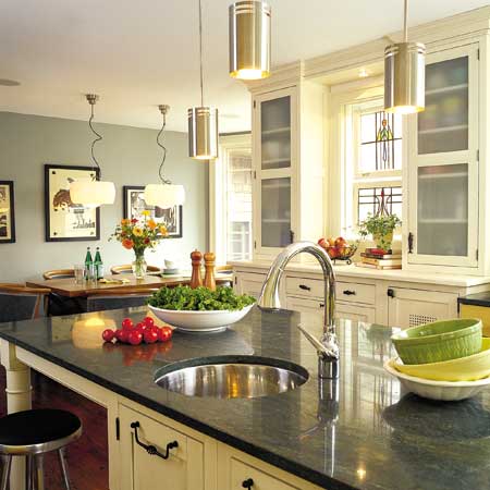Кухненският остров може да създаде невероятно удобство за една домакиня, стига да имате достатъчно място в кухнята, за да си направите такъв. В тази красива бяла кухня кухнеският остров заема цетрално място и изпълнява множество функции. Неговият широк плот, комбиниран с мивка, е идеалната работна площ за приготвянето на продуктите за готвене, а също и след това – за сипването на ястията в чиниите.