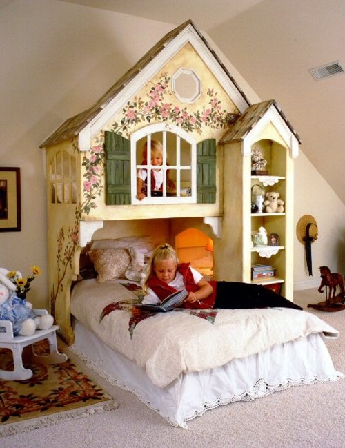 Така децата наистина ще имат свой собствен малък „дом“, в който има място за всичко. Тази дървена къщичка има две легла, прозорци, кепенци, библиотека във формата на къщичка, вградена малка ниша зад нея, красив покрив и фасада, ръчно изрисувана с цветя. В оригиналния модел качването на втория етаж става чрез специални дупки за стъпване, направени от дясната страна на къщичката. Но вместо тях би могла да се направи малка дървена стълба. Малката ниша в стената до долното легло може да се освети чрез нощна лампа, но може и чрез вградена малка лампичка. Тези дървени детски къщички са оригинално и интересно интериорно решение за детската стая.