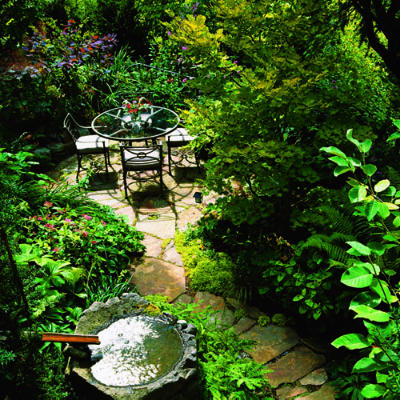 Има особена красота и в по-плътно направените каменни пътеки, като тази пътека, водеща към малък градински кът, обграден с буйна растителност и зеленина.