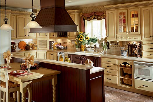 Комбинацията между светъл, млечен цвят, и тъмно кафяв, шоколадов цвят в интериорния дизайн на тази класическа и стилна кухня е наистина страхотна. Постигнат е чудесен контраст, който е омекотен чрез използването и на други междинни цветове от кафявата и бежовата гама. Тъмно кафявият, контрастен цвят, включен в част от кухненския бокс, кореспондира на тъмно кавявите маса и дървена ламперия в трапезария.