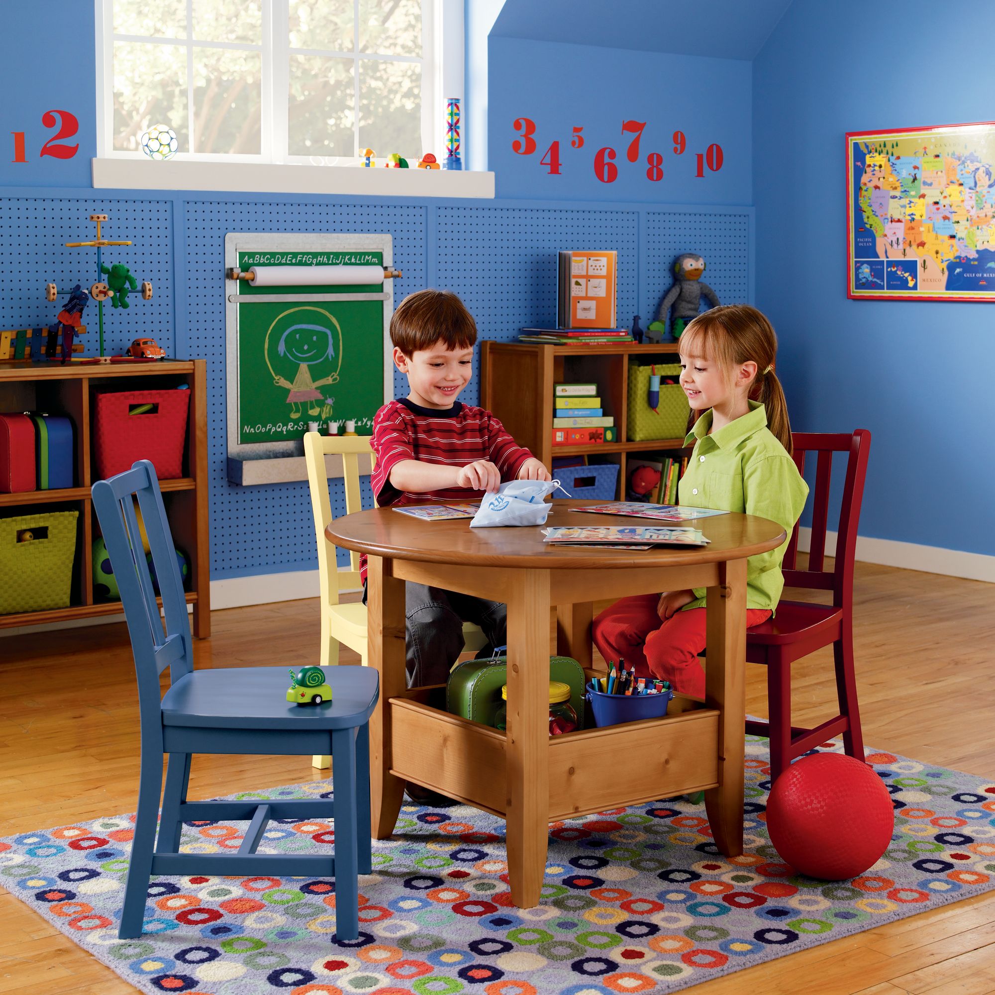 Масата в детската стая трябва да бъде удобна за игра, обучение и занимания на малкото дете. Много практично решение е тя да има предвидено място за съхранение на играчки, книжки, пособия за писане и рисуване. Тази дървена кръгла маса има чудесно голямо отделение за тази цел, което е много удобно и лесно достъпно за децата по време на игра или някакво творческо занимание.