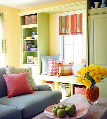 Свежите цветове в интериорния дизайн на тази дневна правят цялостната обстановка много уютна и предразполагаща към почивка и приятно време с близки и приятели. Страхотна идея е тази библиотека в бледозелен цвят да се изгради по такъв начин около прозореца, че пред него да се оформи уютен кът за почивка или четене на някоя книга или списание.