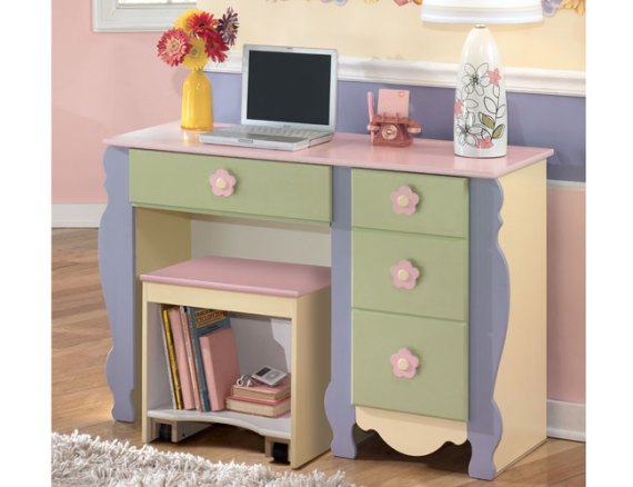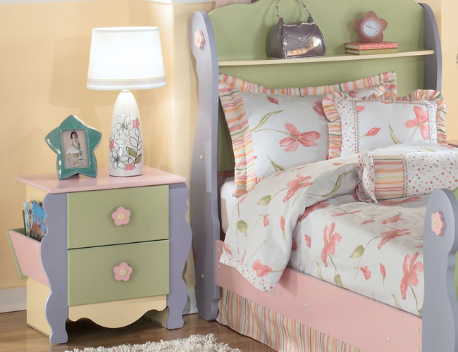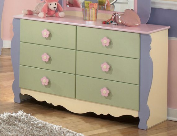 Стаята е предназначена за момиченца, но по подобен начин за момчешка стая също могат да се измислят оригинални дръжки за шкафовете. Нощното шкафче има интересен „джоб“ за списания от едната си страна. Цветовете, формите, извивките, декоративните елементи са обединяващи за цялата серия от детски мебели.