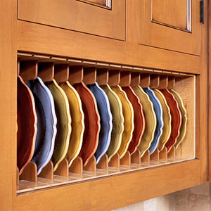 Широкият тъмнокафяв плот е добра работна площ, на която домакинята може лесно да проверява рецепти и при нужда набързо да запише някоя нова. Рафтовете с разделения за чинии са добра възможност за декориране на кухнята с различни комбинации от интересни цветни чинии. В зависимост от смяната на цветовете и десените на други интериорни елементи от кухнята като например покривки, пердета и декорации, на този рафт можете да подреждате различни интересни комбинациии от красиви чинии. Подобен рафт е и много практичен, защото имате лесен достъп до чиниите при сервиране.