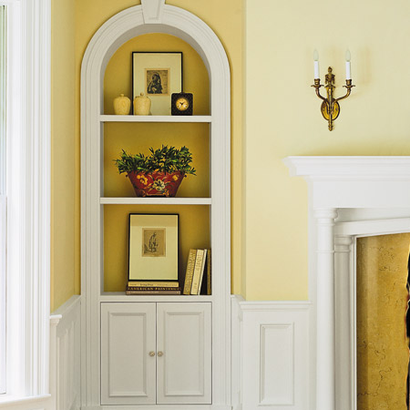 Вградените ниши могат да придадат страхотен акцент на интериорния дизайн на една стая. Особено, когато са дефинирани с красив бял трим върху стена с контрастиращ цвят. Тази ниша с открити рафтове до камината може да служи като библиотека и е идеалното място за поставяне на декоративни предмети.
