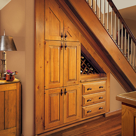 Тези вградени шкафове от масивно дърво са част от кухнята на семейство любители на виното и вратичките „скриват“ гледката на колекция от стъклени чаши и гарафи за вино. За максимално използване на това триъгълно пространство под стълбите, най-горният шкаф и поставката за бутилки вино, са изработени в триъгълна форма.