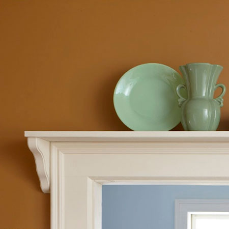 Този рафт, прикрепен над белия трим на рамката на вратата, е много приятен и лесно изпълним декоративен акцент в интериора на стаята. Той е идеалното място да поставите малка колекция от любими ваши керамични предмети или други декоративни аксесоари.