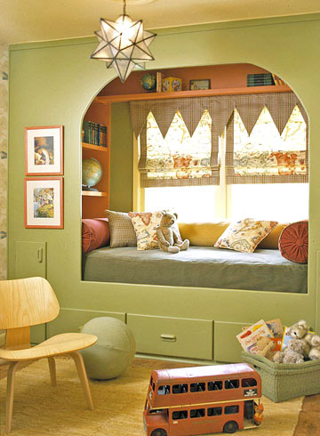 Забележително е как по този начин напълно може да се оползотвори пространството около леглото като се направят множество чекмеджета под него и вградена библиотека от двете му страни и над него. Наистина това е едно много функционално решение за детската стая особено, ако тя е малка. Така ще се осигури повече свободна площ за игра в стаята, като същевременно светлата ниша е чудесно място за почивка и четене на книги.