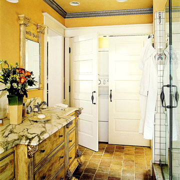 Ако строите малка къща и нямате възможност да отделите цяла стая за мокро помещение, то можете да помислите върху идеята да направите голям вграден шкаф за тази цел. Ето един пример за добре организиран и компактен шкаф, който може да поеме функциите на „мокро помещение“, без да заема твърде много пространство: