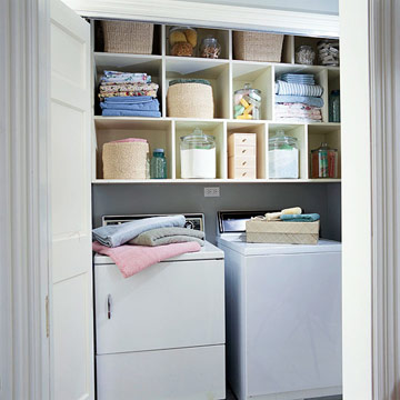 Същевременно в него има място за пералня, сушилня и рафтове над тях с множество отделения за всякакви препарати, прахове за пране, дрехи, кърпи и т.н. Предимството на вградения шкаф е, че можете да сложите врати, които изцяло да скрият гледката вътре. Плъзгащите се и сгъващи се през средата врати са една добра опция за това. Подобен шкаф можете да направите в сутерена, в някой коридор или дори в банята:
