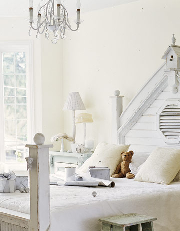 В тази изцяло бяла стая акцент и оригиналност в интериора са внесени с дизайна на дървеното легло, чиято предна табла имитира покрив с къщичка за птички на върха. Като допълнение покривът има и вентилационен отвор. Очевидно в дизайна на стаята е търсен ретро ефект, за което говори състарения вид на леглото и на малкото столче за стъпване, както и старинния полюлей.