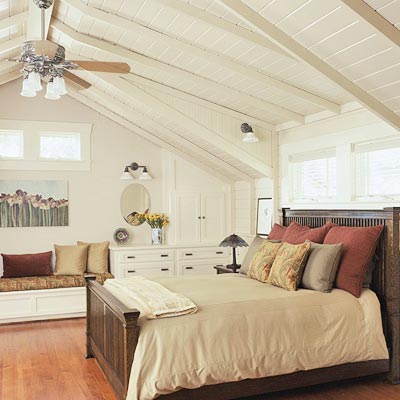 Покривните прозорци могат да внесат много светлина, уют и разнообразие в интериора на подобна спалня на подпокривния етаж. Скосяванията на стените не са проблем по отношение на комфорта, особено като се има впредвид, че човек прекарва само част от времето си в спалнята.