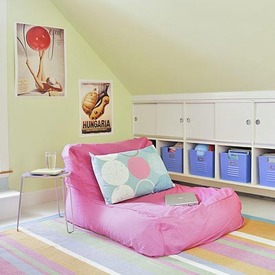 Голямото предимство на подпокривния етаж е, че именно поради скосяванията на стените се отварят много възможности за вграждане на шкафове и чекмеджета, като например в тази детска стая за игра: