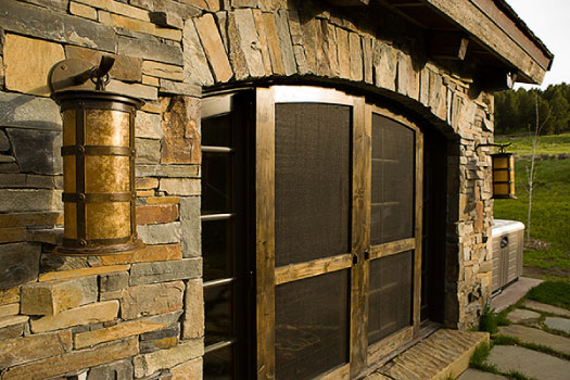 Каменната облицовка и осветление в старинен стил е друг характерен белег на планинския дом.