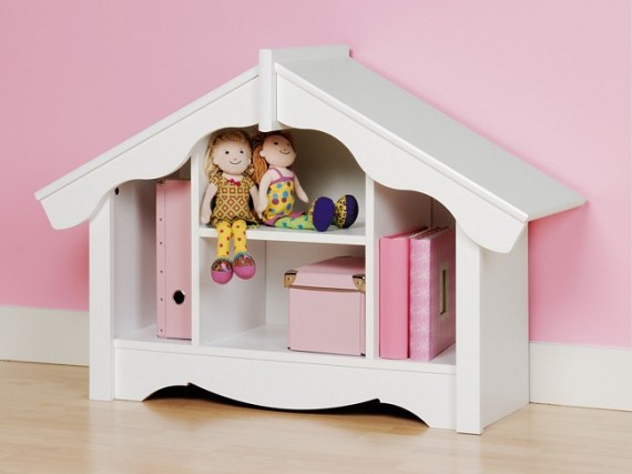 Идеята в интериора на детската стая да се включат малки библиотеки във формата на къщички може да направи дизайна на стаята разнообразен и интересен за детето. Мебелите в тази детска стая биха изглеждали стандартни и обикновени, ако дизайнът на леглото не беше обогатен с предна табла, направена във формата на симпатична детска библиотека-къщичка.