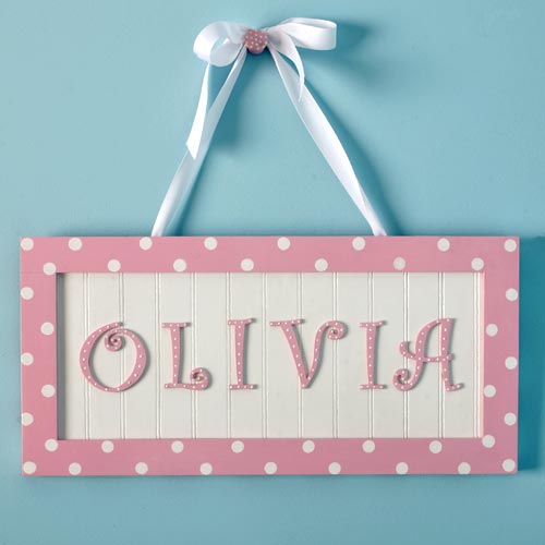 Страхотен акцент за стена са и изработените от дърво персонализирани табелки с инициалите или името на детето. Съчетанието на тези два дървени аксесоара, раираният тапет, меките пастелни цветове и флорални десени, всичко това придава уютен и свеж вид на тази стая за момиченце. Ето още една красива илюстрация на идеята за детска персонализирана табелка от дърво: