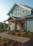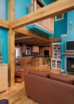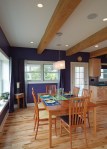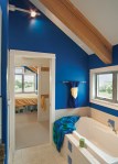 Бихме искали да ви представим серия от снимки на една дървена къща със съвременен дизайн, които вярваме, че ще ви бъде приятно и полезно да разгледате. Двуетажната семейна къща има площ от около 202 кв. м. и разполага с 3 спални, 2 бани, голям хол и трапезария. Уникалното в дизайна на тази къща е подчертаното акцентно присъствие в нейния интериор на масивни дървени греди от дървената й конструкция. Както и комбинирането на естествения дървесен цвят с морско синьо, тъмно синьо и бяло. Холът е централното място в нея и освен, че се намира в едно отворено пространство заедно с кухнята и трапезарията, таванът му стига чак до покрива на къщата. Основната спалня, която е на втория етаж, разполага с вътрешен балкон, гледащ към просторния хол.