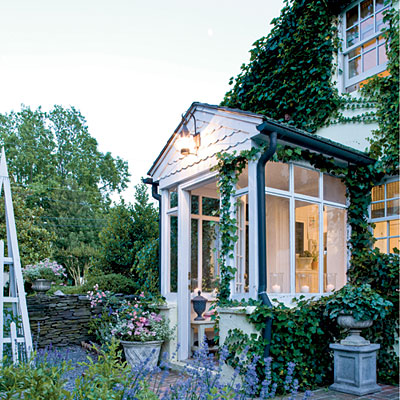 И не на последно място, обградете градината с много зелени храсти и цветя. В случая дори и самите постройки са обвити със зеленина, като е използван бързо растящия Английски бръшлян, който изисква подрязване три пъти годишно. От къщата се излиза към зеленчуковата градина през малко остъклено предверие, което би могло да служи за зимна градина през студения сезон.