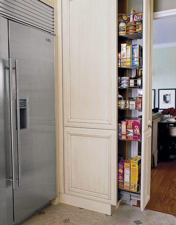 Ако кухнята ви е малка и нямате място за отделен кухненски килер, много ефективно решение е да си направите едно или няколко вертикални кухненски чекмеджета. Подобни чекмеджета пестят място и могат да се вместят дори и в някое тясно пространство между останалите шкафове в кухнята.