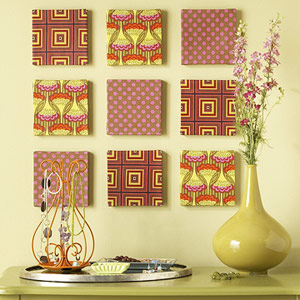 Можете да направите комбинация от девет панела, 3 по 3 еднакви, за да декорирате някое акцентно място в дома си. Това би могло да се постигне като покриете с парчета плат 9 квадратни художнически платна, като платовете могат да се закрепят от задната страна на платната с телбод машина.
