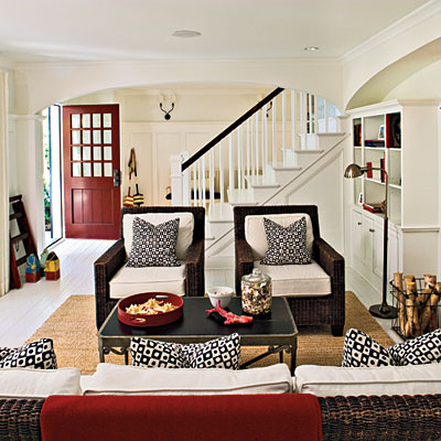 Предимството на белия цвят е, че визуално разширява пространствата и е добра основа за използването на контрастни интериорни решения. Тази всекидневна от тъмна и неприветлива е била превърната в светла и просторна стая чрез изобилното използване на бял цвят и разширяването на порталите към съседните помещения.