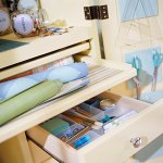 Едно от големите предимства на подобни решения е, че всичко, което е вътре може лесно да се скрие зад затворените врати. Шкафът е организиран по начин, че всички онези дребни предмети и аксесоари, свързани със шивачеството, да си имат точно определено място и да са подредени в различни видове малки отделения, контейнери, джобове и т.н. Вътрешната част на вратите, както и пространството върху шкафа също са използвани за складиране, а плъзгащият се навън рафт може да служи като удобен работен плот. По-подробно можете да разгледате шкафа като кликнете на снимките по-долу: