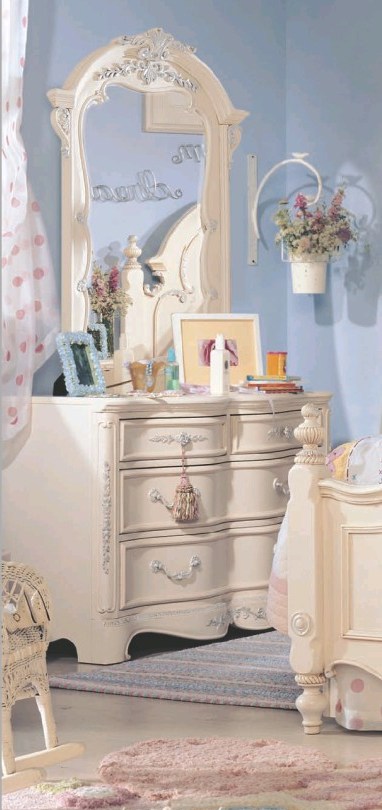 Тази красива колекция от дървени мебели за стаята на момиченцето е изработена с много нежен дизайн, постигнат с меки форми и извивки и изящни гравирани орнаментални детайли. На отделни места са приложени и фини сребърни акценти. Изборът на пастелени цветове за интериора на стаята също е изключително приятен.