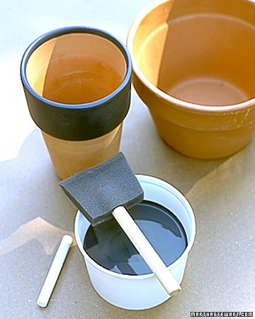 Боядисайте горната част на саксиите с боя за черни дъски, която ще позволи да надписвате саксията с тебешир. По този начин ще можете да организирате своите растения и разсади, и най-вече саксиите с подправки. Върху лентата за надписване бихте могли да отбележите и честотата на поливане. Тебеширеният надпис лесно може да се изтрие след това с мокра гъба или парцал. Преди да приложите боята върху саксията, поставете бояджийска самозалепваща се лента, която ще ви улесни при боядисването.