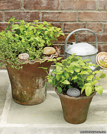 Другата идея във връзка с надписването на видовете растения е изключително лесно изпълнима, но същевременно е много ефектна от визуална гледна точка. Намерете няколко гладки обли камъка, надпишете ги с азбучни печати и перманентно мастило, или с перманентен маркер, и ги поставете в саксиите. Така камъните с надписите ще изглеждат като естествена част от оформлението на саксиите.