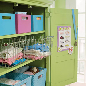 За по-голямо улеснение кутиите е добре да се надпишат. Поставете любимите играчки и често използваните дрехи на най-долните рафтове, така че детето да може да ги достига. От вътрешната страна на вратите можете заедно да закачите негови картинки, рисунки или снимки.