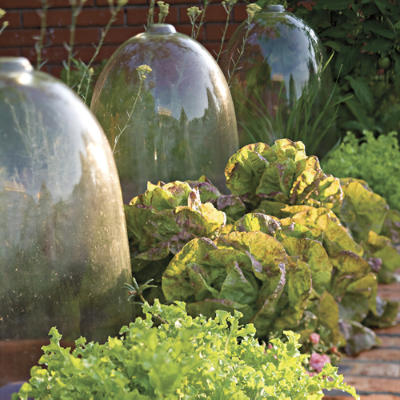 Основен елемент в тази живописна и спретната градинка са двете еднакви дървени градински къщички, а останалата част от градината най-вероятно е симетрично разположена спрямо тях, ако можем да предположим от снимката. Страхотна идея е оформлението на повдигнати лехи със тухлички, а пътеките от дребен чакъл предпазват от развитието на бурени и допринасят за по-добрия дренаж на дъждовната вода. Всичко в този двор е постигнато със стил и внимание към детайла. Включително можем да забележим и използването на стъклени похлупаци (или т.нар. bell jars), които освен че играят ролята на малки парници, от визуална гледна точка са един доста приятен акцент в градината.