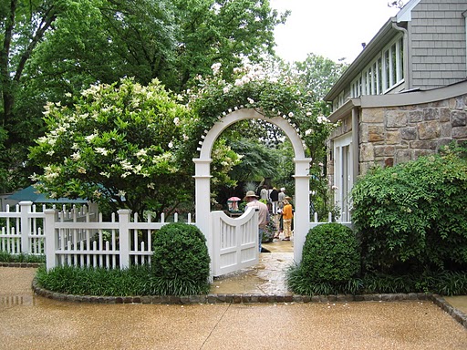 Белият цвят изпъква невероятно добре сред зеленината на храстите и дърветата, въпреки че за всеки е ясно, че цената за поддържането на безупречния вид ще е висока, но си струва. Красотата на арката се вижда в пълна сила, когато тя служи като подпора за увивни храсти и цветя, като розите са едни от най-предпочитаните за целта.