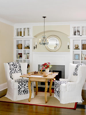 Това е един страхотен дизайн на подобни библиотеки, които са вградени около камината. Можем да видим финия детайл, който е използван при изработването им, както и при оформлението около камината. За разлика от съвременните плоски библиотеки, изящните декоративни елементи и фрезовани детайли в дизайна на тези библиотеки им придават повече обем и усещане за класика и стил.