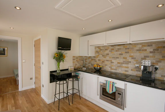 Кухнята е достатъчно голяма и функционална. Отворените пространства премахват усещането за малкия размер на къщата и позволяват да усетите простор дори на малката площ.