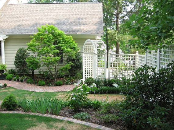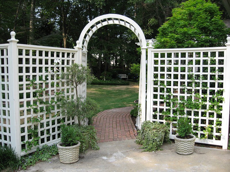 Освен оформлението с павета, пътека, лехи с цветя и саксии, подобен кът може да се обогати и като се постави на стената на къщата дървена решетка, която може да служи за закачане на декоративни елементи, но също така и като подпора за пълзащи и увивни растения. В същия стил като решетката са изработени и входната арка и оградата: