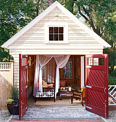Удивително е до каква степен малките допълнителни постройки в двора могат да допринесат за увеличаването на жизненото, складовото, работното и т.н. пространство на дома ни, в зависимост от това за какво ще се използват. Тази малка градинска къщичка е красиво допълнение към екстериора на основната къща и има двойна функция според сезона. През зимата собствениците я ползват за гараж, а през топлите месеци – за къщичка за почивка и за посрещане на гости.