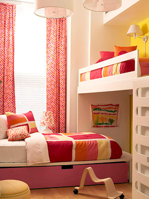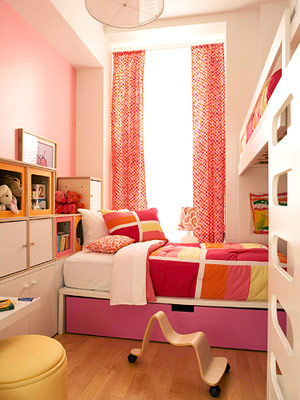 Можете да видите, че става въпрос за една наистина малка и тясна стая, но при добра организация е постигната много добра функционалност и децата разполагат с красиви мебели с модернистичен дизайн и с немалко място за съхранение на вещи. Свежият дизайн на мебелите и изборът на цветовете (в случая стаята е за момиченца) допринасят за приятната обстановка.