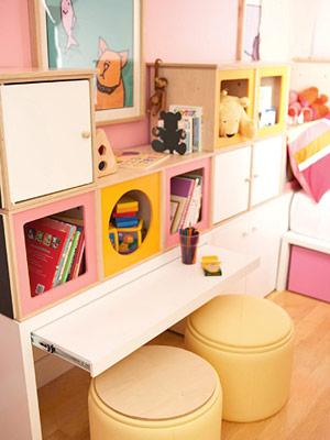 Плотът на бюрото има възможност да се прибира навътре, когато децата не го ползват, а множеството шкавчета във формата на кубове също са интересна идея за детската стая.
