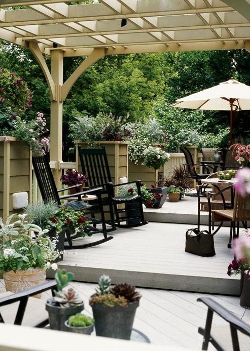 Ако имате голяма веранда, тук можете да видите някои добри решения, които биха могли да ви помогнат за нейното оформление. Разделянето на верандата на няколко различни нива ще ви помогне за създаването на няколко обособени кътчета в нея – за почивка, за хранене, за игра на децата, и т.н. При оформянето на различните зони бихте могли да използвате и дървени структури като арки и перголи, както и градински чадъри или навеси.