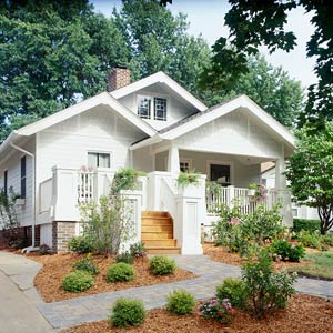 Силният наклон, който първоначално е водел към къщата, сега е балансиран с добавянето на стълби, а верандата освен покрита има и открита част. Бялата оградка на верандата и двете пирамидални колони придават стилен и изискан стил на първоначално невзрачната къща. И за да се обогати и освежи гледката докрай, предният двор е облагороден с цвета и зеленина и пътека, подканваща посетителите към входа.