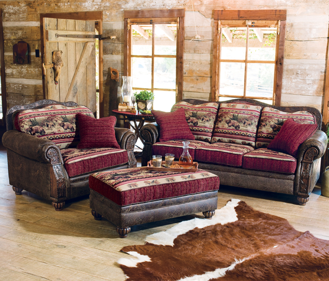 В лог интериорите меката мебел обикновено е от естествена кожа или в комбинация с дамаска характерна за планинския стил.