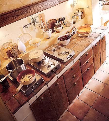 Кухненски плотове от глинени плочки, комбинирани с грубо обработена дървесина е  още един характерен елемент за селска кухня.