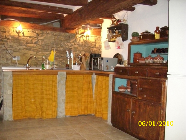 Тук имаме камък, дърво, перденца, все характерни елементи за хубава селска кухня. Но пропорциите, изпълнението, финиша на дървените части са некачествено направени от там цялата визия пропада. Дори оригиналния стар кухненски скрин е финиширан ужасно и стои на петна, защото е правен от хора лишени от познания за дървото и качествената му обработка. Да видим дали така стоят нещата, когато се правят от хора с разбиране:
